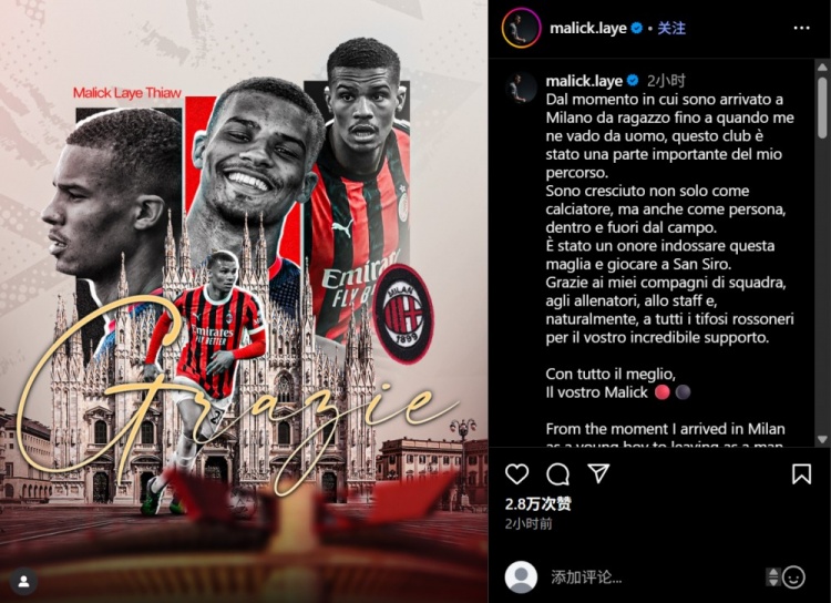 佳夫离开米兰感言:有幸穿上红黑战袍在圣西罗征战是我莫大的荣耀